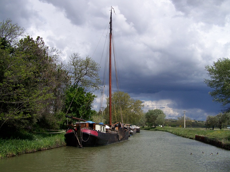 Ik denk dat het maar een woonboot is. Wanneer je met een platbodem op de Canal du Midi wil varen, moet je de mast streken. De bruggen zijn erg klein…